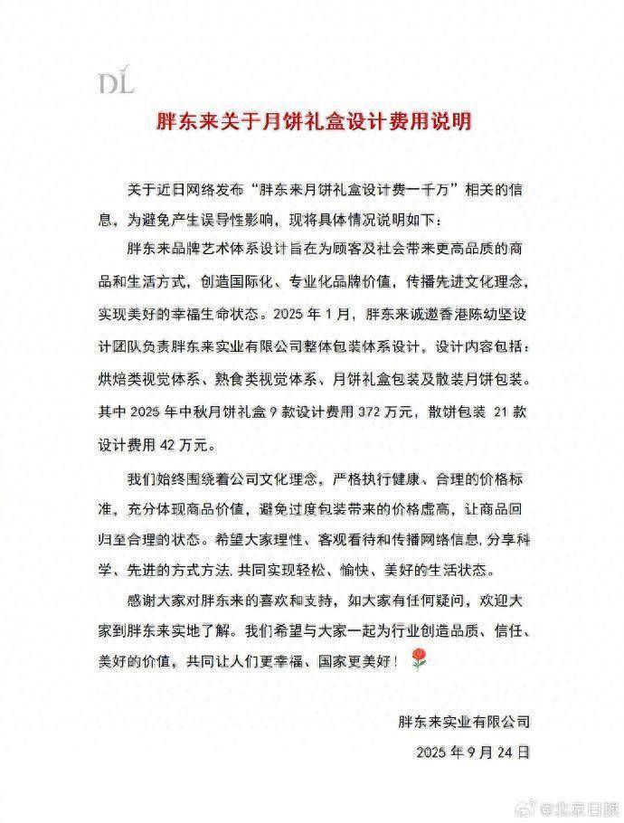 9月24日晚,胖东来实业有限公司发布声明,关于近日网络发布“胖东来月饼礼盒设计费一千万元”相关的信息,为避免产生误导性影响,现将具体情况说明如下: